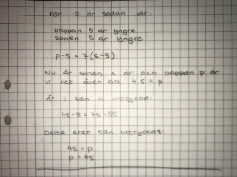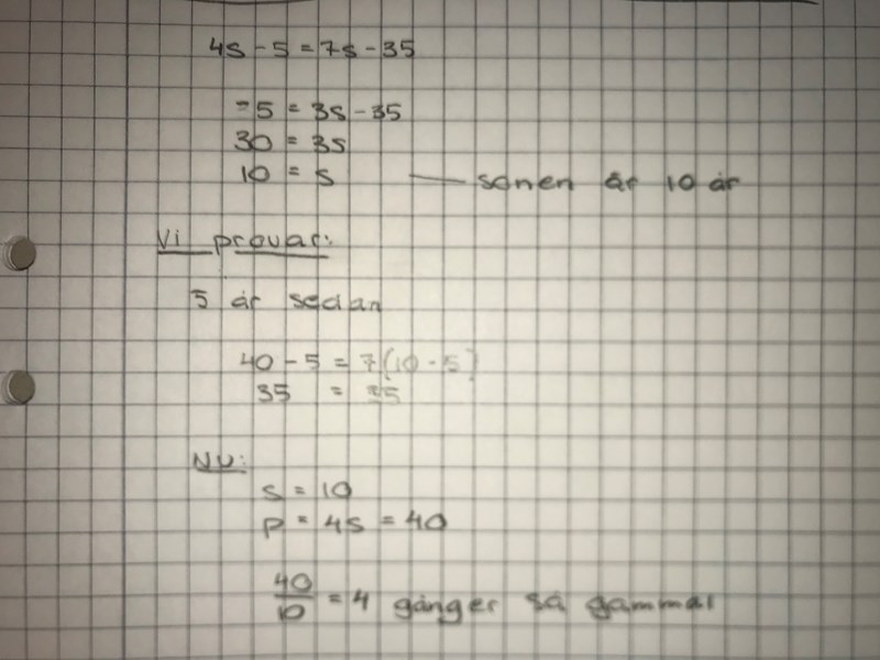 "En far är fyra gånger så gammal som sin son, för fem år sedan var fadern sju gånger så gammal än sonen, hur gamla är far och son nu?"