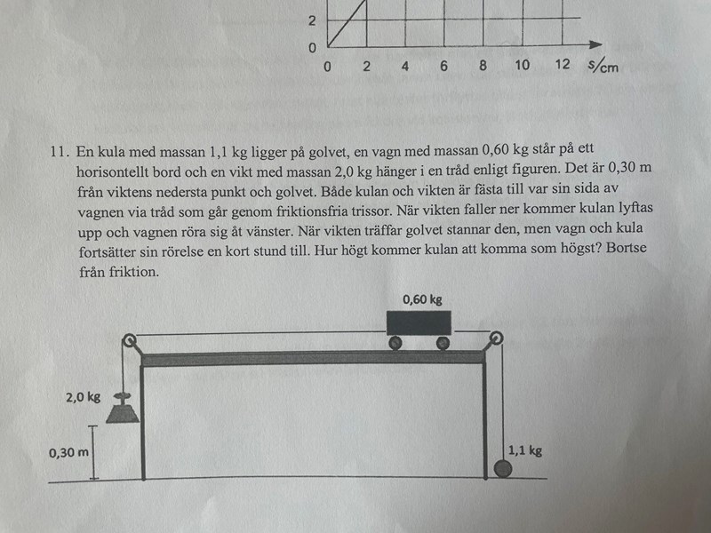 Jag tänker att man möjligtvis ska räkna ut rörelseenergin för att sedan kunna ta ut höjden i lägesenergin (mvh). Problemet är dock att det är svårt att omvandla alla energier, från viktens rörelseenergi till vagnens rörelseenergi och till sist kulans. Vet man kulans kan man ju räkna ut höjden den når. Jag tror att det är vagnens rörelseenergi och kulans som jag har svårt att hitta. Är detta ett vettigt resonemeng eller bör man lösa den på annat sätt?
