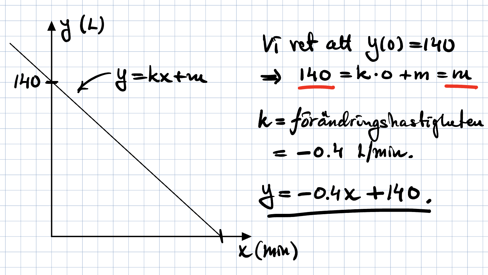 En tank innehåller 140 L vatten, sedan går den sönder och läcker sedan 4 dl i minuten vad är formeln för den uträckningen ? om man ska använda sig av räta linjens ekvation?