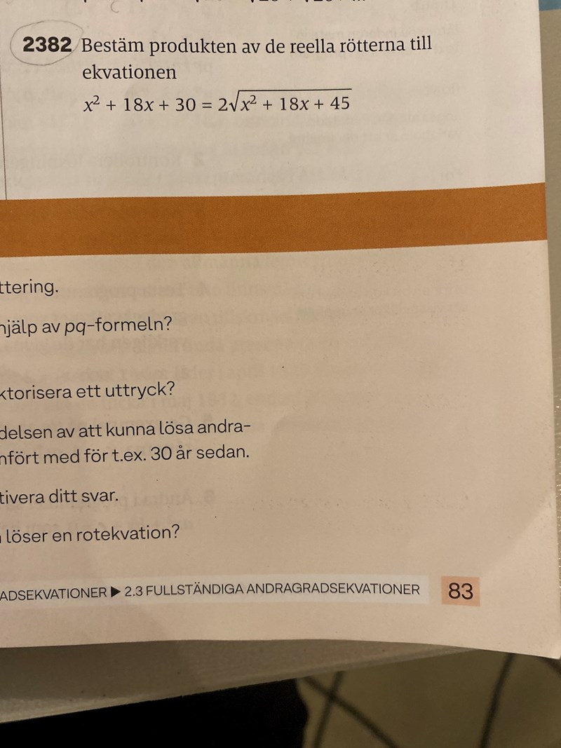 Jag har varit fast på denna uppgift ett tag. Jag har försökt att lösa det genom en substitution där jag ersatt det under rottecknet med t. Dock blir rötterna konstiga och inte i nättheten av svaret!