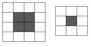 När du som i figuren ovan har fyra mörka rutor, så svarar det mot 12 vita rutor. Det är 4*2 + 4 rutor, dvs 4 partier med samma antal rutor som den mörka kvadratens sida plus en ruta i varje hörn. Har du 9 mörka rutor blir det 4*3 + 4 vita rutor, och så vidare.