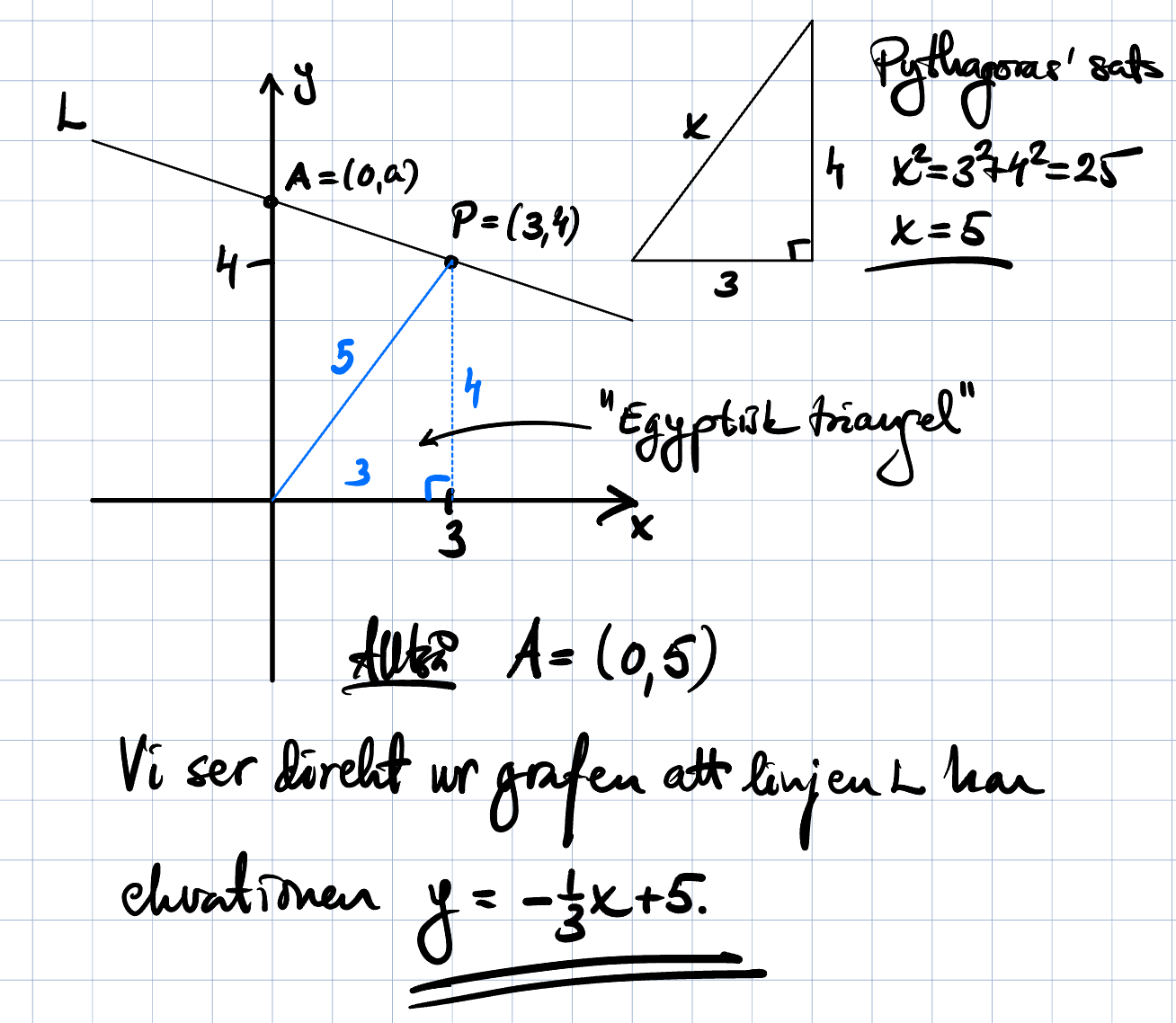 : Figuren nedan visar en rät linje som går genom punkten P(3, 4). Linjen skär den positiva y-axeln i en punkt A. Avståndet mellan origo och punkten A är lika stort som avståndet mellan origo och punkten P. Bestäm ekvationen för den räta linje som går genom punkterna A och P.