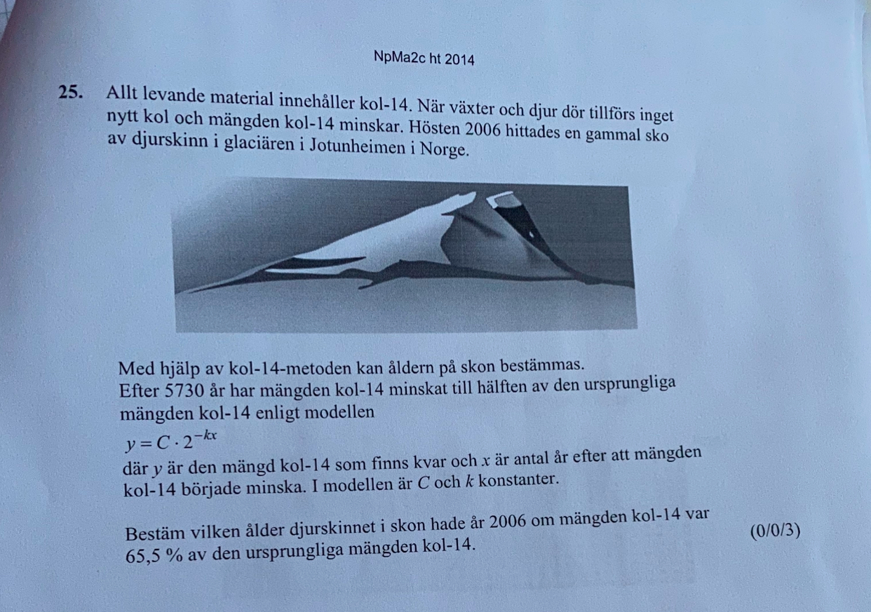 Nu ska vi räkna ut hur gammal skon är om den hade 65.5% kvar år 2006. Då kan vi ställa upp ekvationen