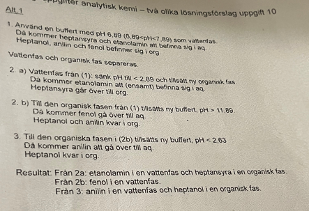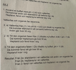 Hur gör du för att få följande ämnen i fem olika lösningar genom extraktion: anilin (pKb 9,37), etanolamin (pKb 4,50), fenol (pKa 9,89), heptanol och heptansyra (pKa 4,89)? Etanolamin är hydrofil medan övriga ämnen är hydrofoba.