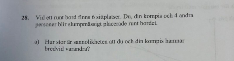 Sätt dig själv först (Eftersom det är ett runt bord är ju alla platser likadana, så det blir ingen begränsning). Hur många platser har din kompis att välja på? Hur många av platserna är bredvid dig? Hur stor är sannolikheten att din kompis sitter bredvid dig?