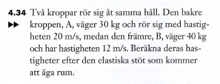 jag tänker att totala rörelseenergin och rörelsemängden är lika före och efter stöten. rörelsemängden = 1080 kgm/s och rörelseenergin 8880J. sedan ställer jag upp ett ekvationssystem, där x är A:s hastighet efter stöten, och y är B:s hastighet efter stöten. se bild.