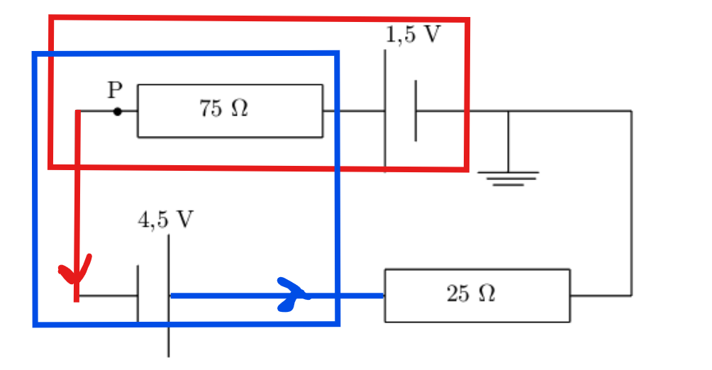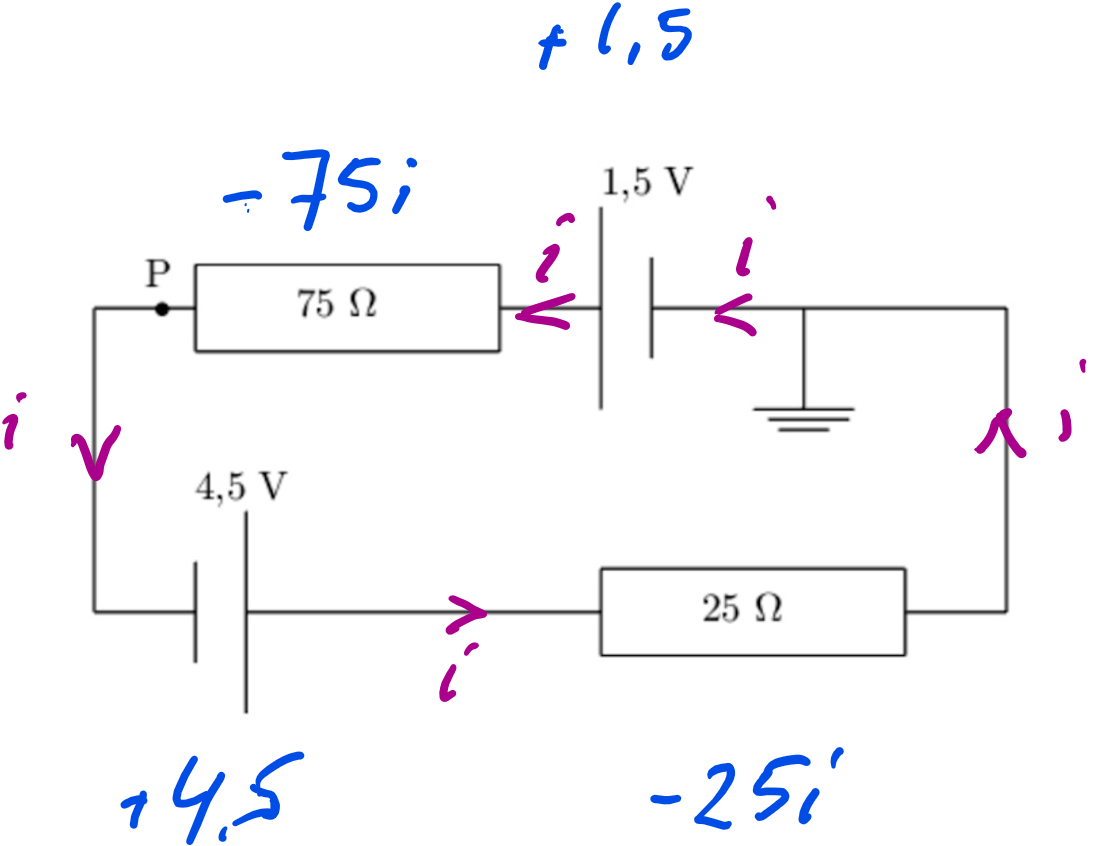 När jag försöker få reda på strömmen i kretsloppet som jag skickade överst så blev den röda delen 0,02 A och den blåa 0,06 A. Går jag vidare och tar 4,5 V genom 25 Ω så blev det 0,018 A och sist så om jag tog 1,5 genom 25 så blev det 0,06 A. Jag ser ju att det blir samma storlek på ström när jag tog 4,5/75 och 1,5/25, men jag förstår liksom inte vad det andra betyder. Jag liksom tappar bort mig och blir dessutom förvirrad av jordningen.