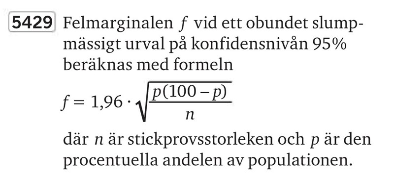 Smaragdalena skrev:Nej, formeln ger "felmarginalen på konfidensnivån 95 %". Om man vill ha t ex "felmarginalen på konfidensnivån 99 %" får man använda en annan formel (troligen är det bara konstanten som har ett annat värde än 1,96).