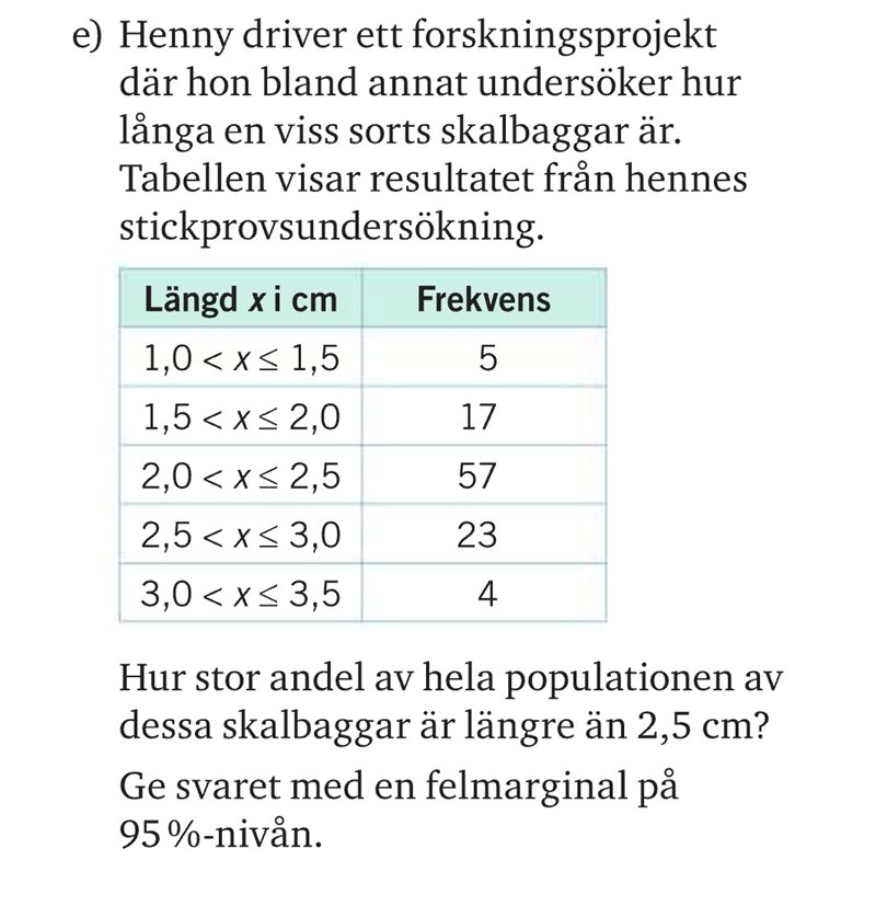 Antalet skalbaggar ur stickprovet som är längre än 2,5cm är 27st. Totalt i stickprovet är 106 skalbaggar.