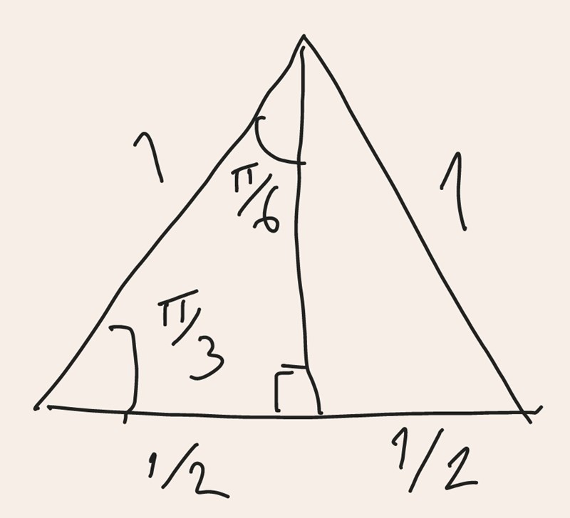 Pythagoras sats för att räkna ut den sida som man inte känner till, alltså (1/2)^2 + b^2 = 1^2. Detta ger b=(√3)/2