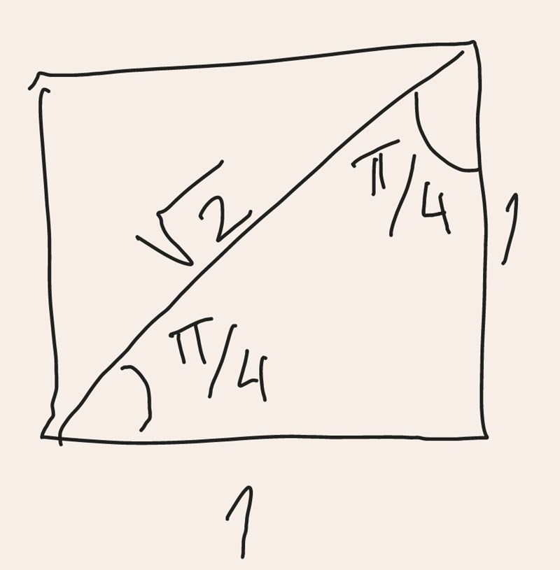 Första figuren visar en "halv kvadrat". I den rätvinkliga triangeln som uppstår då kvadraten delas av en diagonal är de två spetsiga vinklarna båda 45°, dvs radianer.