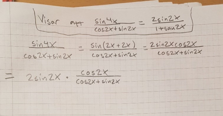 Tex visa att: (2sin(2x))/(1+tan(2x)) = (sin(4x))/((cos(2x))+sin(2x))