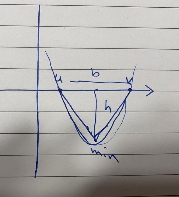 Vad vet vi om höjden h på triangeln? Det är avståndet från x-axeln till funktionens minimipunkt. Vad är funktionsvärdet där? Var har derivatan sitt nollställe?