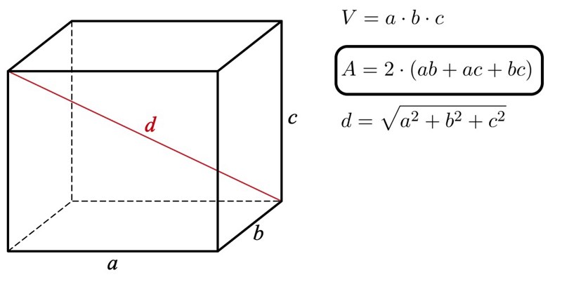 En kub är ett rätblock där alla sidor är kvadrater. Ett rätblock är en kropp där alla sidor är rektanglar. Din formel är fel - du skall addera de tre paren av sidor, inte multiplicera dem (om jag gissar rätt när jag tror att du menar multiplikation när du skriver ".").