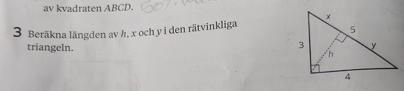 Du vet att x+y =5. Använd formeln för arean av en triangel på två olika sätt för att få fram h. När du vet h kan du använda Pythagoras sats för att beräkna y, och därefter är det enkelt att räkna ut x. (Det går lika bra att räkna ut x m h a Pythagoras sats och därefter y, om du föredrar detta.)
