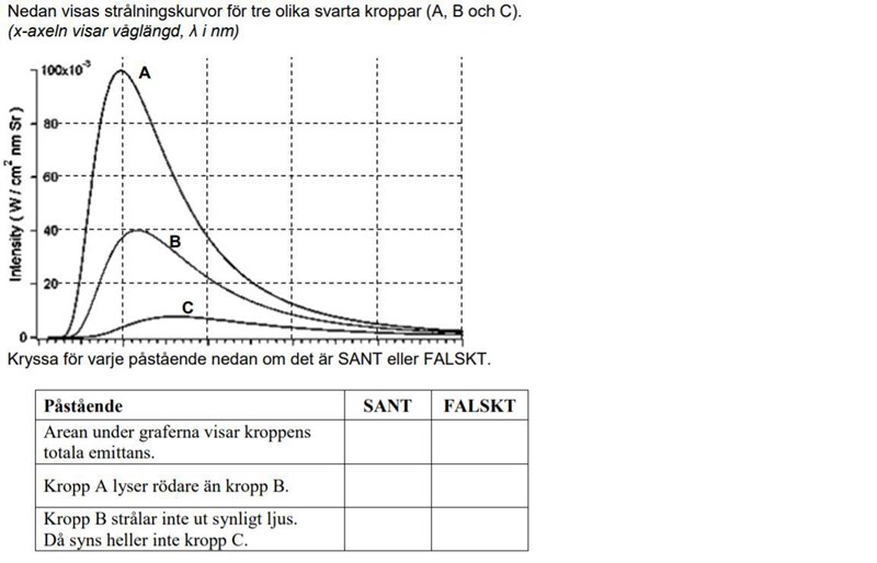 Andra påståendet resonerade jag att kropp B lyser rödare för att de har en högre intensitet av längre vågor än A, dvs går åt det rödare hållet , och därmed falskt. Men jag hänger inte med på hur jag avgör hur mycket längre vågorna är, skulle det tex kunna vara mikrovågor? och räknas dessa som rödare ?
