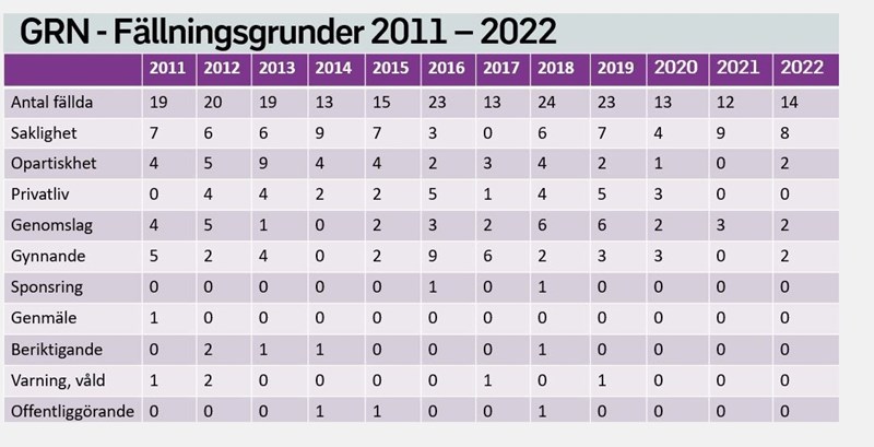 Jonto skriver: "Granskningsnämnden granskar som sagt hela SVT:s utbud och SVT fälls en handfull gånger per år för opartiskhet." Jag tycker inte det stämmer helt.