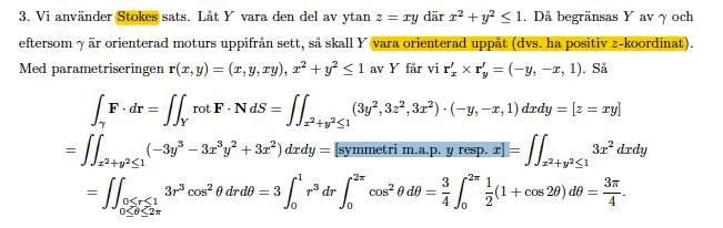 Är det något av stegen i det här inläggen du inte hängde med på? Vi tar oss alltså ur dilemmat att integranden vare sig är udda eller jämn genom att dela upp den i summan av två funktioner, som är jämn och som är udda m a p y (men jämn m a p x, men det spelar ingen roll eftersom noll gånger nånting = noll), och då blir det bara integralen av 1 som "överlever".