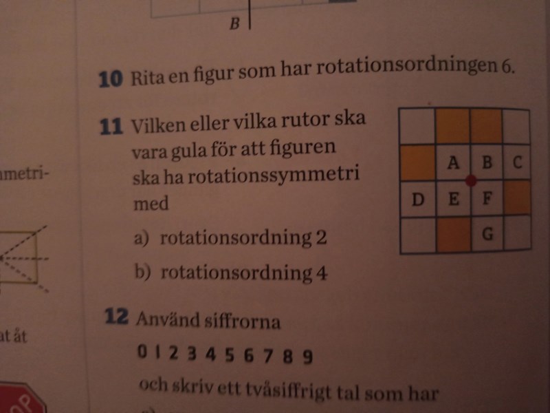 Det första steget är att röka ut hur mycket man ska rotera i uppgift a resp b. Då behöver man veta vad rotationsordning betyder. När man har gjort det så ritar man hur figuren skulle se ut efter en sådan rotation. Vilka rutor behöver färgläggas för att figurerna ska vara lika.
