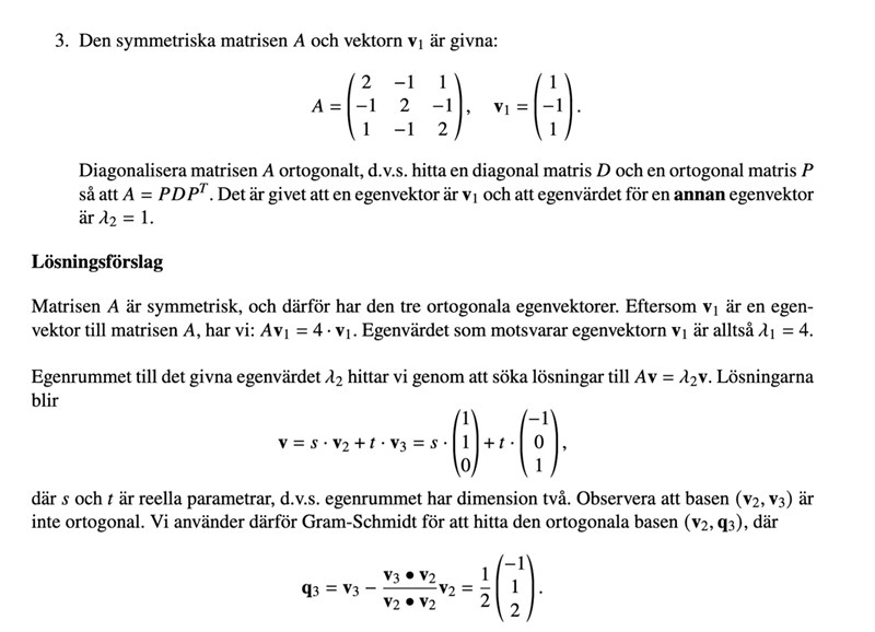 LuMa07 skrev:M.h.a. Gram-Schmidt skapar man en ny vektor i egenrummet till . Hela detta egenrum är vinkelrätt mot , d.v.s. varje vektor i detta egenrum är vinkelrät mot . Därmed är även den nyskapade vektorn vinkelrät mot .