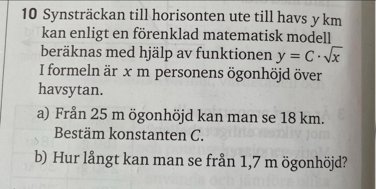 Denna kan du stoppa in i funktionen y= C*sqrt(x), där y anger synsträckan till horisonten och x anger ögonhöjden över havsytan.