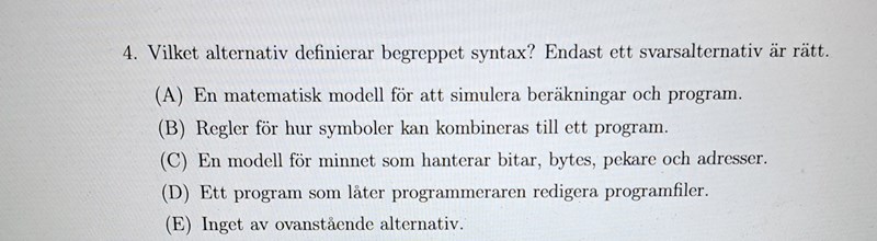 Jag fick fel på dessa två frågor. Jag valde 4E eftersom jag tänkte att syntax innebär regler för hur en kod ska skrivas i ett programspråk,men rätt svar är B). Gällande uppgift 6 är C) rätt svar. Jag vet ej vad // innebär i python,kan det vara att man avrundar till ett heltal när man tar 1/2? Jag valde B) för jag tolkade som att vi får ett decimatal.