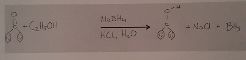 Bensofenon löses med etanol och blandas sedan med natriumborhydrid i vatten. Detta sedan till koncentrerad HCl+vatten. Bilden är mitt resultat.