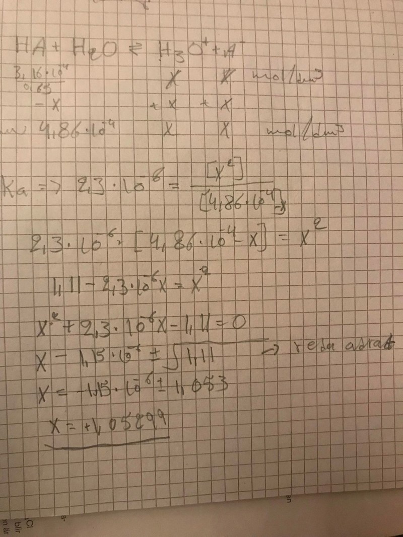 På lab ska du framställa en 650ml syralösning med pH 3,5 av en svag syra med Ka= 2,3*10-6 M. Hur stor substansmängd behöver du?