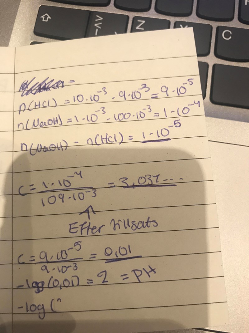 Jag tänkte räkna koncentrationen för vätejoner alltså c=n/v = 10mM/9mL men det blir 1,111.... och för att räkna ut pH utifrån koncentrationen blir det ett negativt pH värde. Vad gör jag för fel?