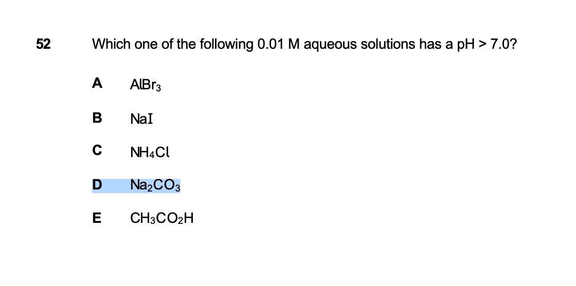 Fundera på vad som händer när de olika ämnena A-E hamnar i vatten. En del av dem är salter, som löser sig till sina joner, som kan påverka pH (upp eller ner).