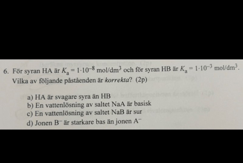 D) HA är en svagare syra än HB och därför är A- starkare bas än B-.