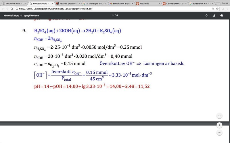 Beräkna pH i en blandning av 25 cm3 0,0050 mol/dm3 svavelsyra och 20 cm3 0,020 mol/dm3 kaliumhydroxidlösning.