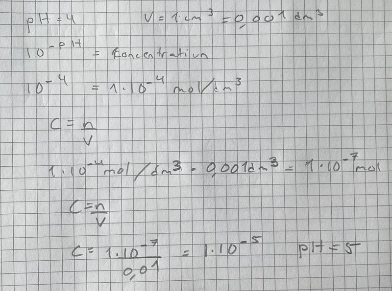 I en lösning av saltsyra är pH = 4,0. Vilket pH får lösningen om man späder 1 cm3 av lösningen till 10 cm3?