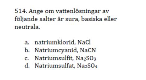 Teraeagle skrev:a, b och c är rätt. d är en luring, för man kan tro att den också blir basisk men vätesulfatjonen är en förhållandevis stark syra, så pass stark att sulfatsalter blir neutrala.