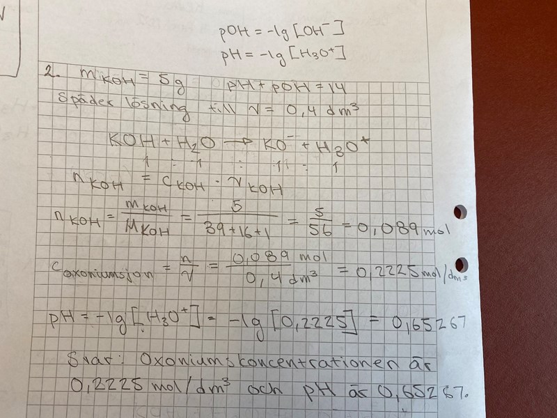 man löser 5 g kaliumhydroxid i vatten och späder lösningen till en slutlig volym av 0.4 dm3. Beräkna lösningens oxoniumjonkoncentration och pH. Jag vet bara hur man räknar ut hydroxidjonskoncentrationen inte oxoniumjonskoncentrationen. Hur ska jag ta mig till? Tack