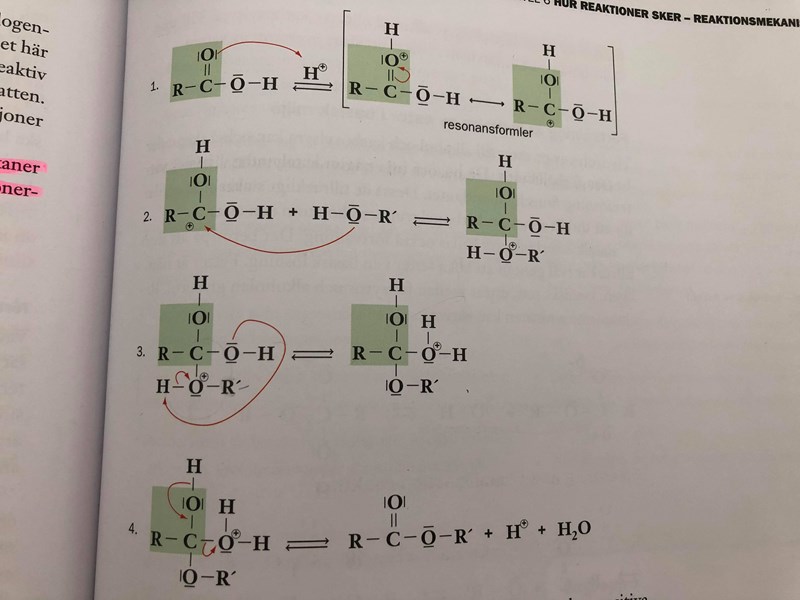 Min bok visar hur en ester bildas. Jag undrar varför syret vid steg 3 (både vänster och höger) blir positivt laddat? Jag har lärt mig att den atomen som har högre elektronegativitet blir minus-laddat. Syret har ju högre elektronegativitet än både vätet och kolet borde den inte då bli negativt laddad?