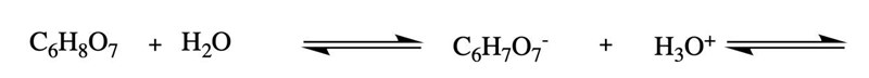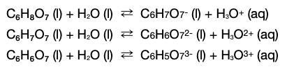 C₆H₈O₇ (l) + 3H2O (l) → C6H5O7- + 3H3O+ (aq)