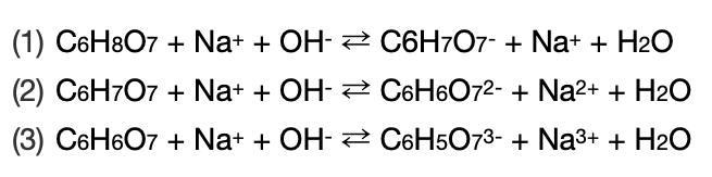 (C6H8O7     +   Na+   +   OH-    <=>   C6H7O7-   +  Na+    + H2O)     och sedan fortsätter det i två steg till tills  C6H5O73- bildats (och så klart motsvarande mängd vatten från protonerna och OH- som går åt).