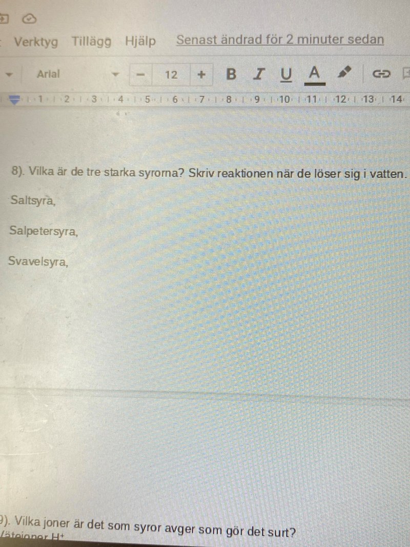 Jag har skrivit ner vilka de tre starka syrorna är men jag förstår inte ”skriv reaktionen när de löser sig i vatten”. Jag har googlat men jag falsett inte. Vad är det för reaktion och hur skriver jag den för varje syra?