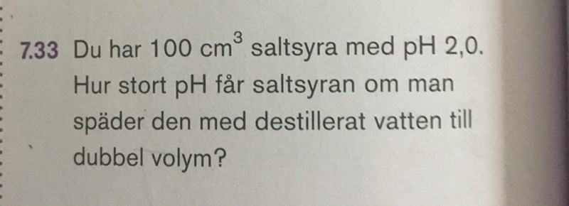 Du har alldeles rätt i att [H+]=0,02mol/dm3 när pH=2,0. Vilken blir koncentrationen av vätejoner om du späder denna lösning till dubbla volymen? Vilket pH-värde har en lösning med denna [H+]?