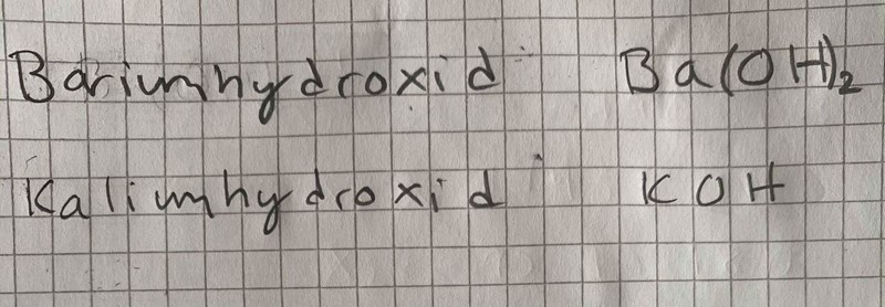 Vilken är formeln för bariumhydroxid respektive kaliumhydroxid? Hur många mol hydroxidjoner finns det i 0,2 mol bariumhydroxid? Hur många mol hydroxidjoner finns det i 0,4 mol kaliumhydroxid?