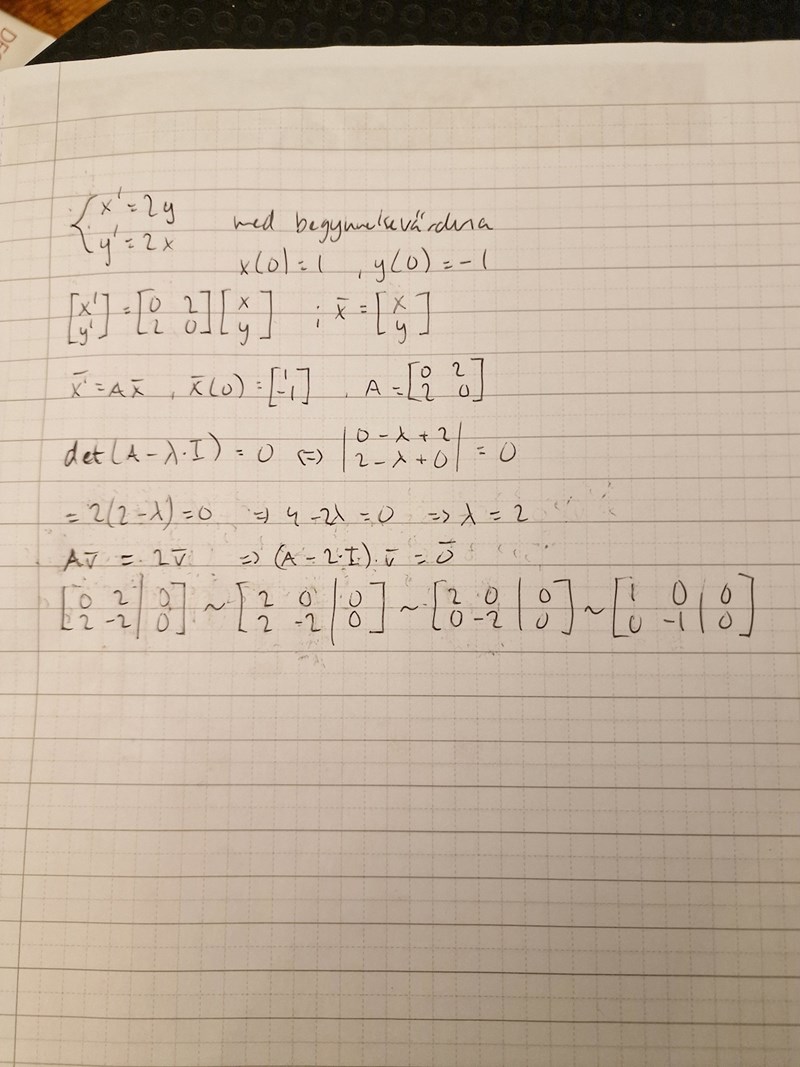 Du finner så småningom att du vill ha determinanten på A-[lambda]*I till 0, vilket jag får till [lambda]2-4 = 0, vilket gör att [lambda] är 2 eller -2.