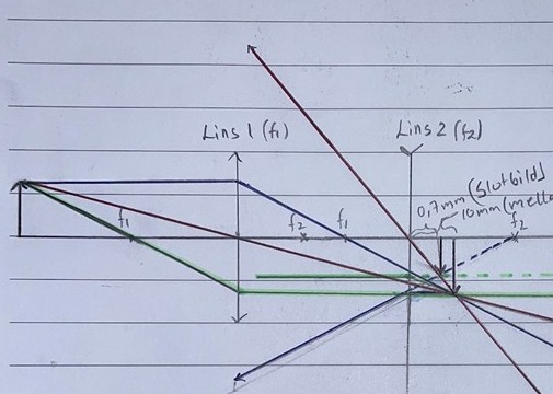 Är lite undrande om linjen du ritat från det högra f2 och vänsterut genom lins 2. Det ser ut som lins 2 skulle vara konvex. Borde inte den strålen vinklas nedåt som om den kom från det vänstra f2?
