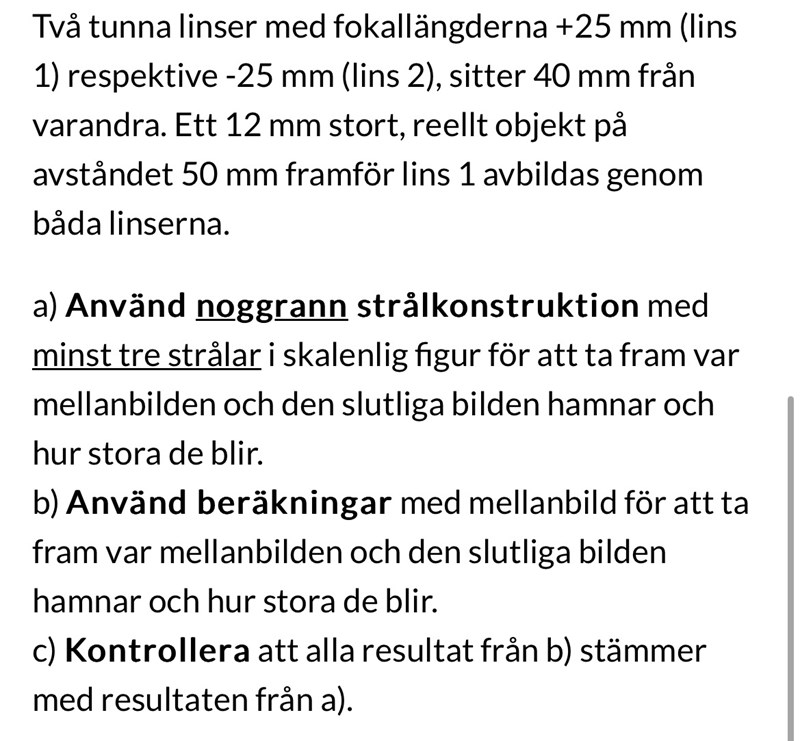 Hej, jag har gjort en strålkonstruktion för systemet av en konvex och konkav lins enligt uppgiftsbeskrivningen. Mellanbilden hamnar på ett korrekt avstånd i strålkonstruktionen (50 mm ifrån lins 1, vilket också bekräftats från mina beräkningar).