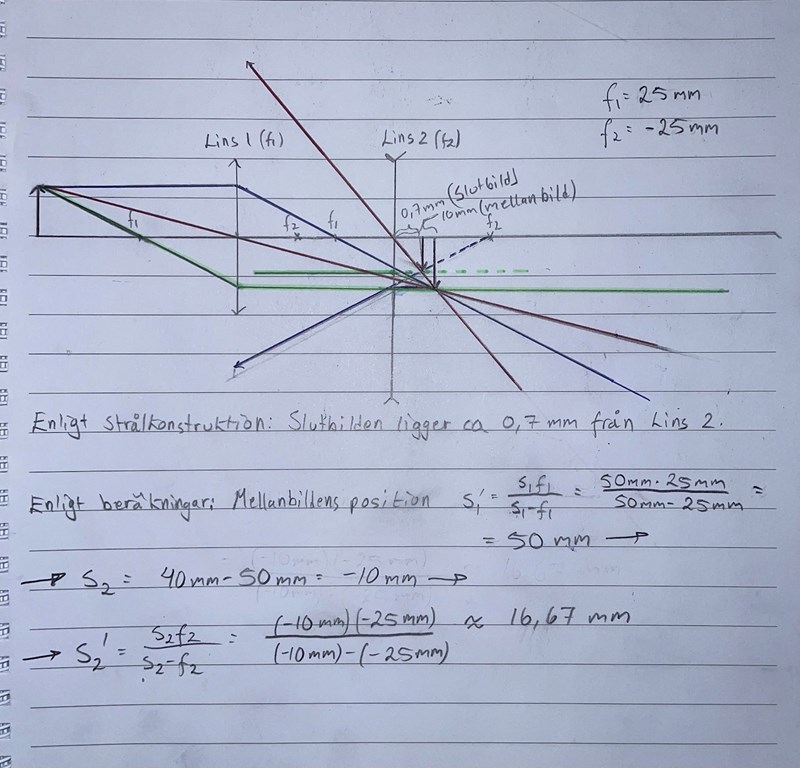 Däremot hamnar  slutbilden på ett avståndet 0,7 mm från lins 2 i strålkonstruktionen, vilket inte stämmer med mina beräkningar som ger ett avstånd på ca 16,67 mm. Jag förstår inte vad jag har gjort fel? Figuren är skalenlig.