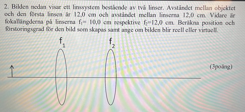 I boken finns det en exempeluppgift där två linser kombineras för att få fram en slutgiltig bild. Men i den uppgiften konvergerar strålarna på ett specifikt ställe och skapar en bild innan den andra linsen, och man säger att den bilden agerar objekt för den andra linsen.