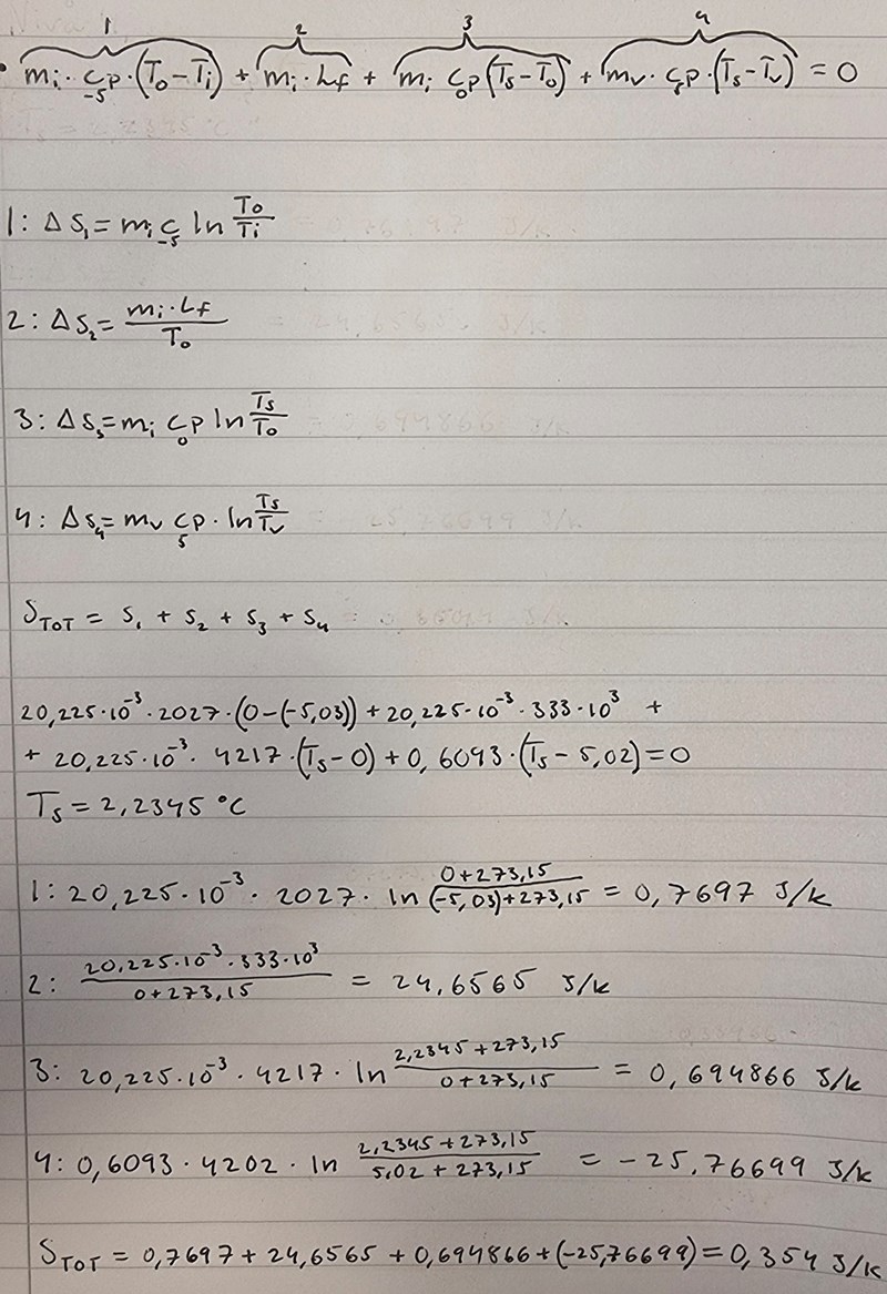 Vad blir systemets (vatten + is) totala entropiändring om iskuben har temperaturen −5,03 °C?