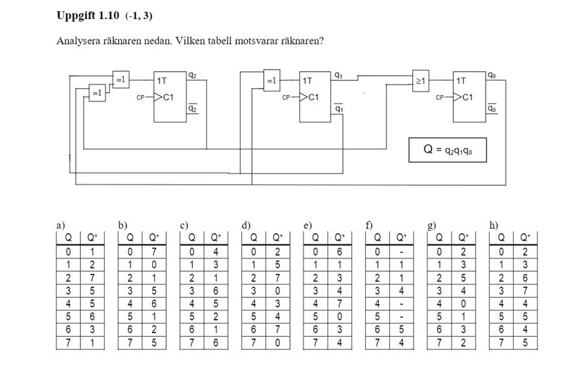 Jag får dock fel utvärde av dessa funktioner då rätt svar är e), stoppar jag in 110 som är det andra tillståndet (6) får jag att T1 = 0, men den skall bli 1.