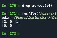 Jroth skrev:>>> p0=[2,0,1,0,0] >>> list(filter(lambda element: element != 0, p0)) [2, 1]