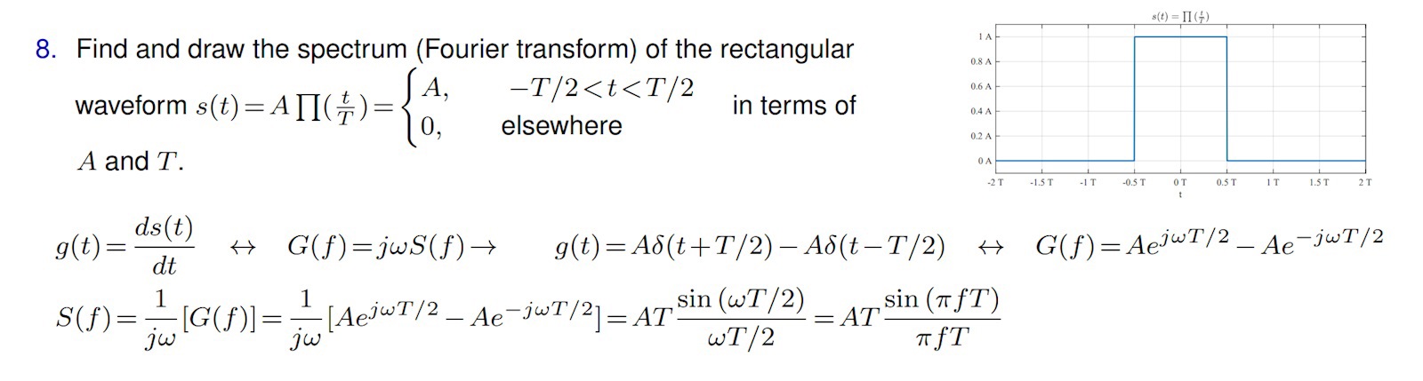 En ny funktion g(t) görs som är derivatan av s(t). Sedan tas fourier transform uttrycket fram för g(t) (dvs. få fram den i frekvensplanet), vad är det som händer, varför görs detta?